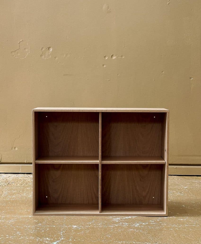 A small, empty wooden planter sits centered in a room with plain beige walls and a matching beige floor—an unadorned, minimalistic backdrop perfect for showcasing unique finds or inspiring interior designers seeking timeless home style.
