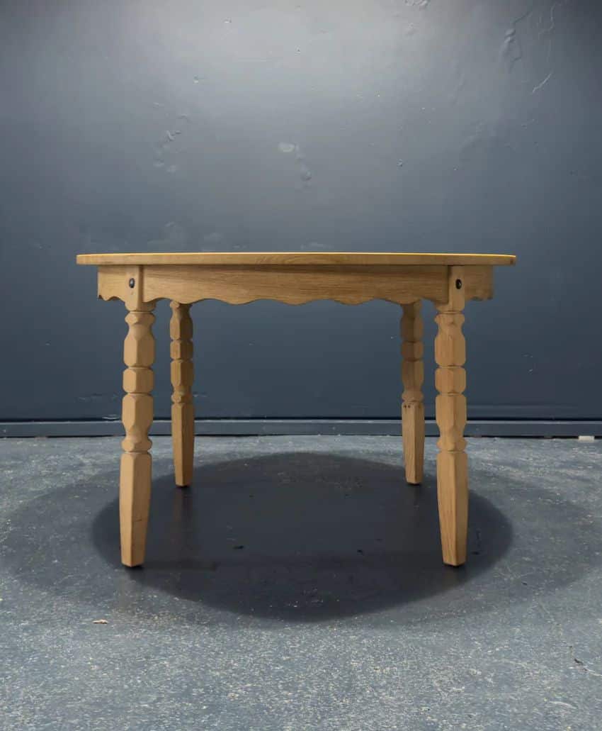 A wooden table with light-colored legs and a darker tabletop is set against a plain dark gray wall and concrete floor. The table has a simple, mid-century modern design.