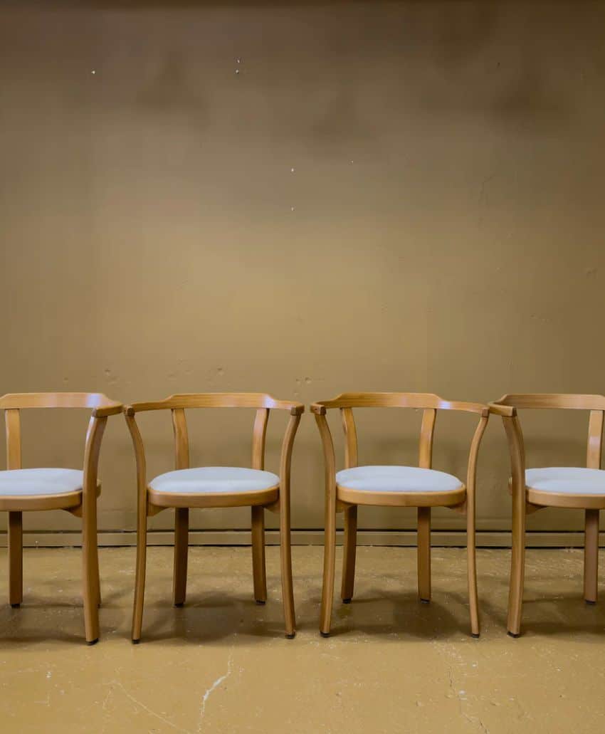 A small, light-colored loveseat with wooden legs sits against a plain tan wall and brown floor in a minimalist setting.