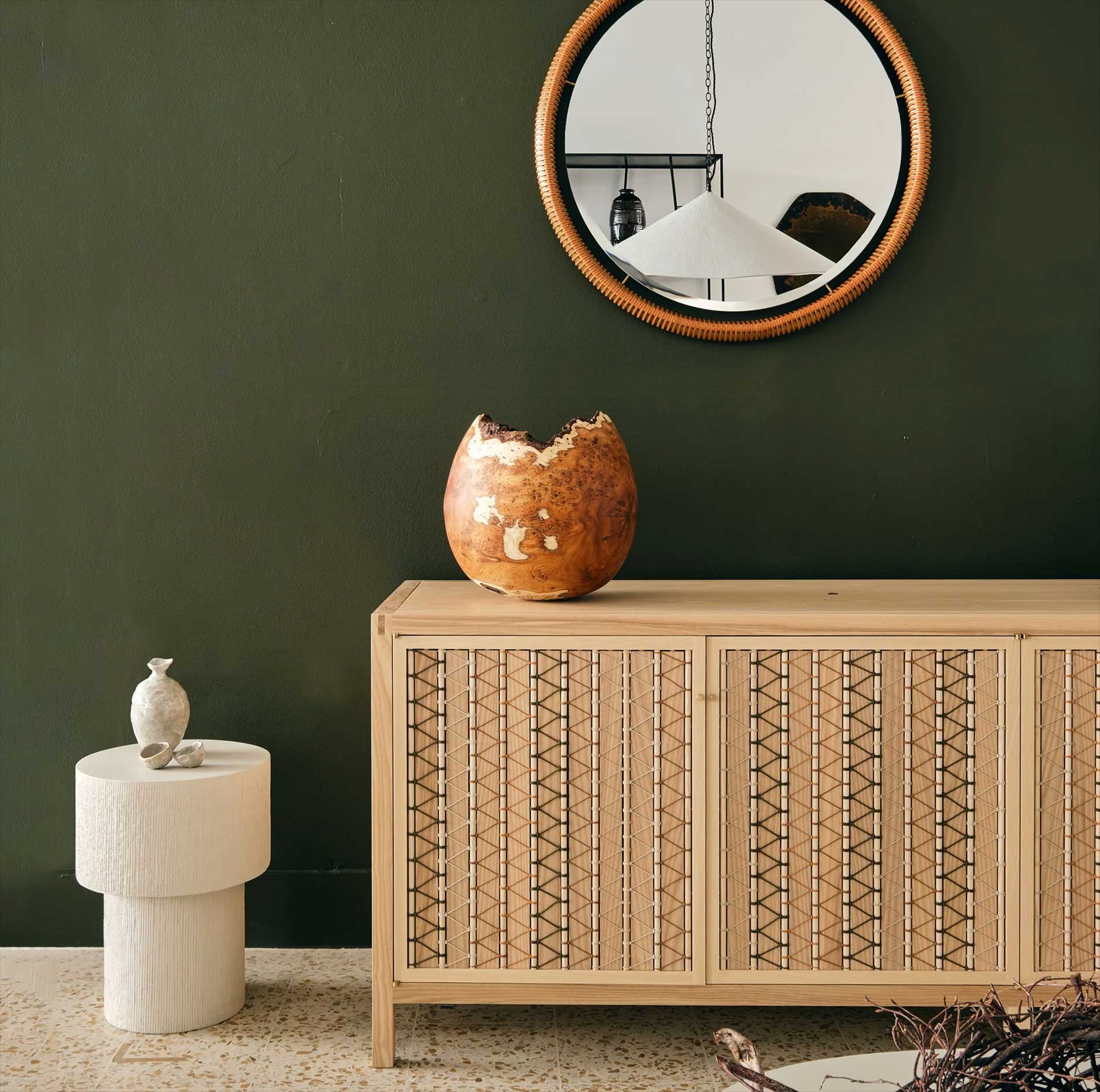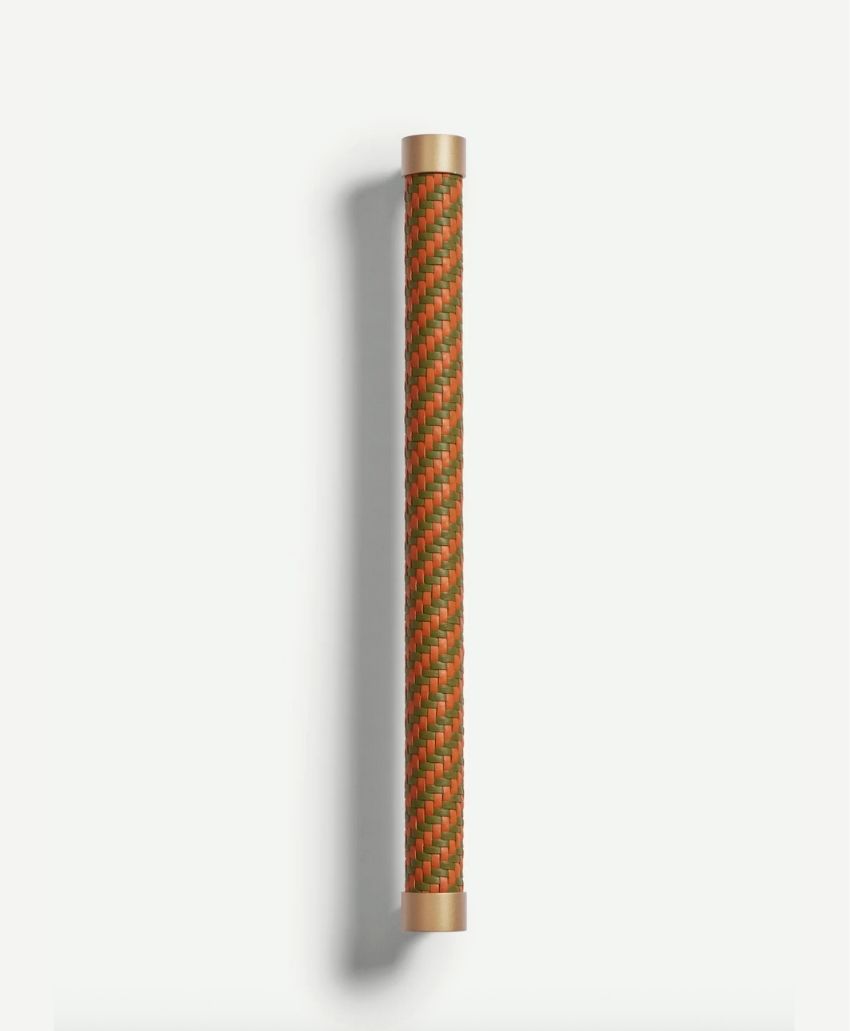 Aimee draws inspiration from her family’s textiles lineage, with her work referencing historical textiles and leather craft from museum collections, galleries, and books. Every piece is made to order in her Berkshire studio using carefully sourced, high-quality materials, including leather lacing, cord, and reclaimed silk, which are expertly worked onto lighting, mirrors, handles and cabinetry.