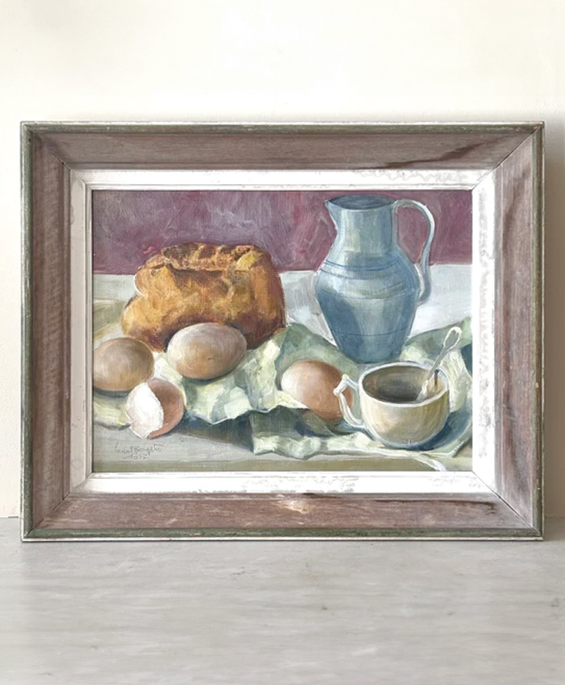 A framed painting shows a rustic interior with stone floor, wooden table, buckets, barrels, broom, and a caged bird. Through an open door, a woman sits at a spinning wheel in a dimly lit room.
