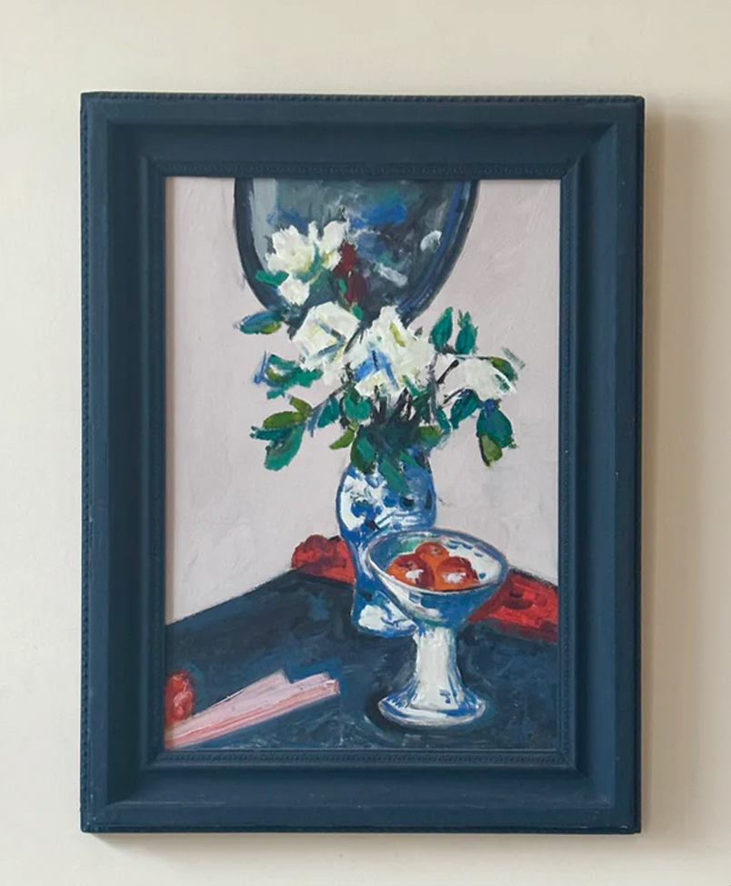 A framed painting shows a basket filled with colorful flowers on a white table. In the background, two small, vintage portraits hang on a plain, light-colored wall.