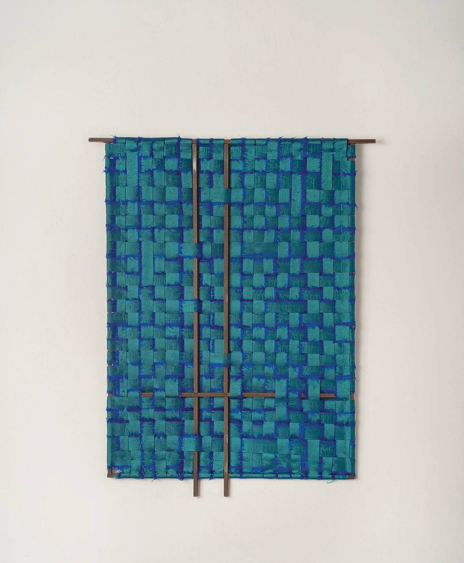 A textured art piece with shaggy, dark blue and black fibers hangs on a plain white square board. Yellow geometric shapes are partially visible beneath the fibers. The board is mounted on a gray wall.