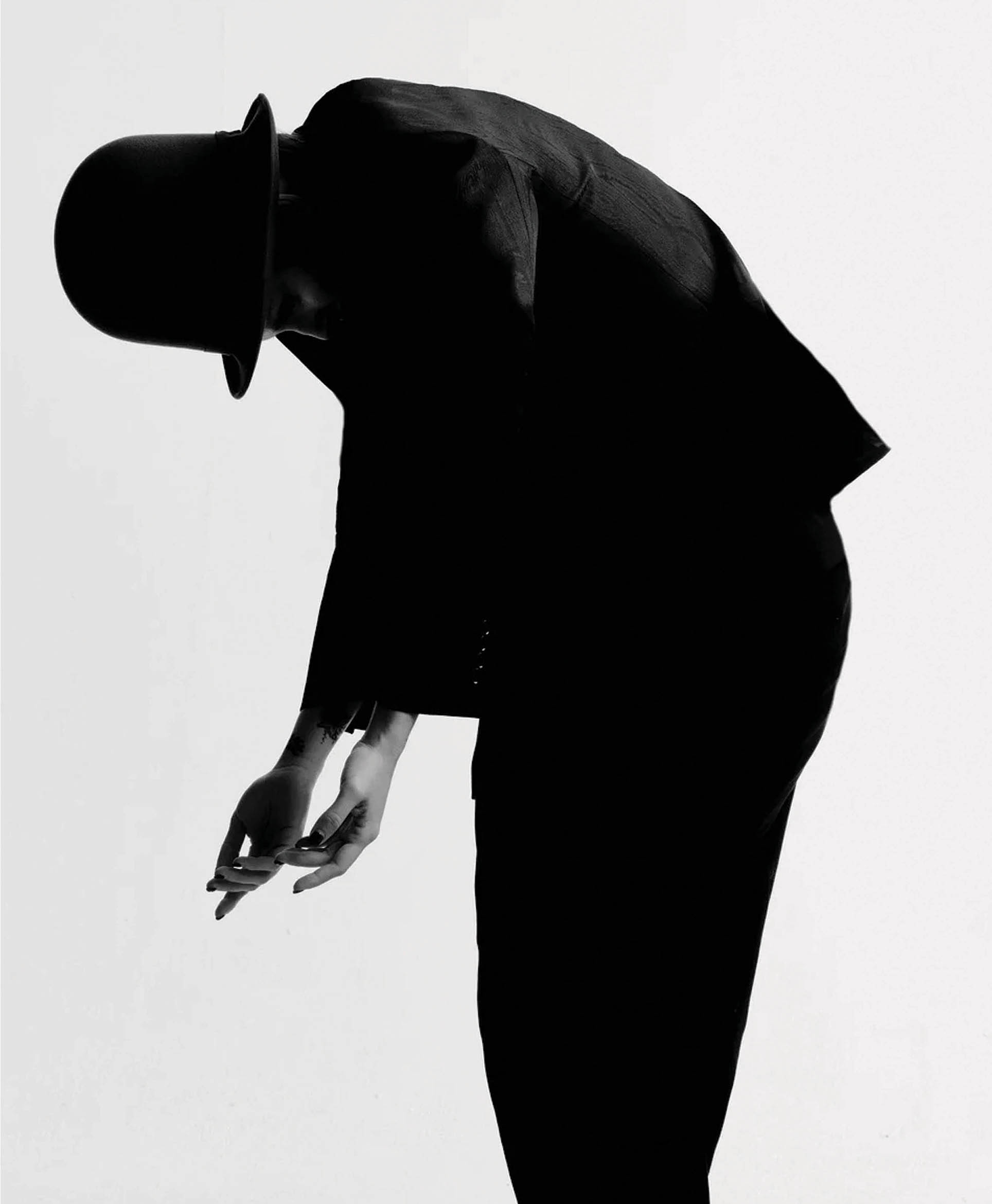 A figure draped in textured white fabric bends forward, with a brown braided ponytail tied with a pink ribbon visible against the cloth. The background is gray and muted in tone.