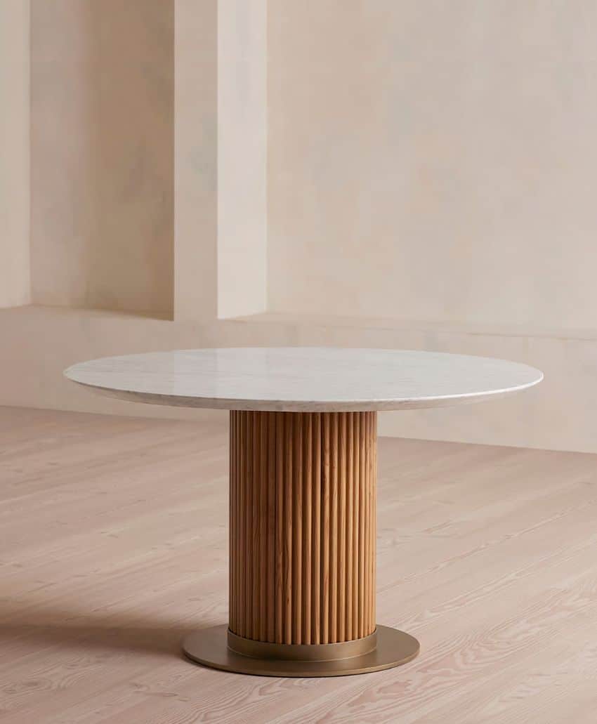 A round table with a pinkish marble top and a geometric wooden base, set against a plain, light background.