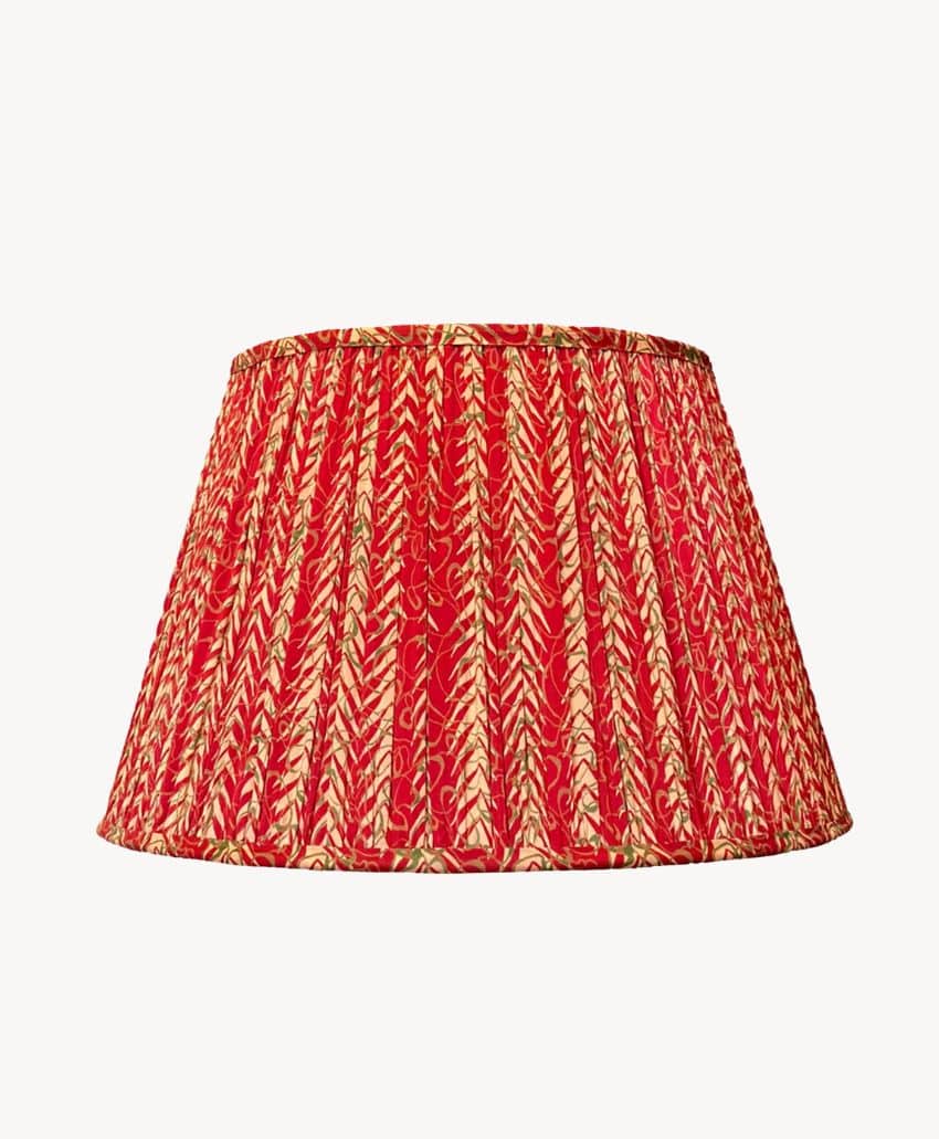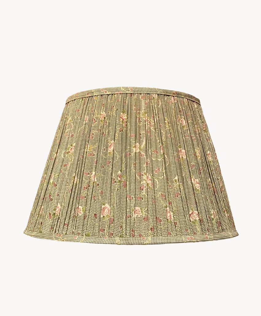 A pleated lampshade with a pattern of pink, green, and white vertical stripes, set against a plain white background.