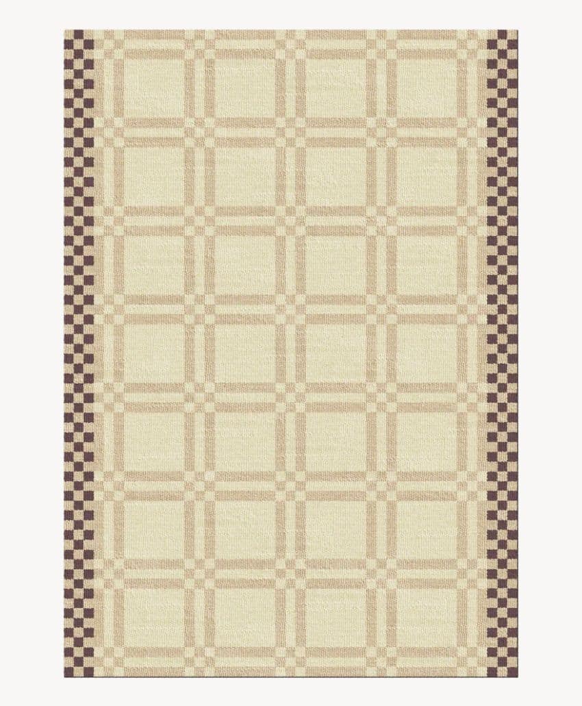 A rectangular beige rug with a simple grid pattern of evenly spaced thin dark lines forming squares across the surface.