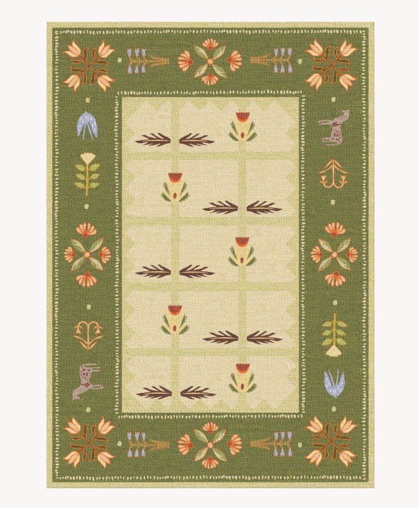 A red rectangular rug with a floral border and small decorative flowers in green, white, blue, and yellow, arranged along the edges and in a central symmetrical pattern.