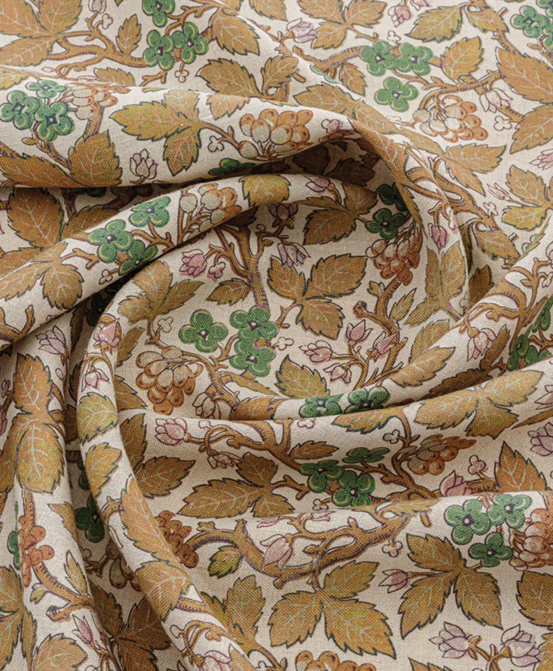 Beige fabric with a repeating, abstract brown floral pattern, shown in several folded layers. The texture of the material and the intricate design are clearly visible.