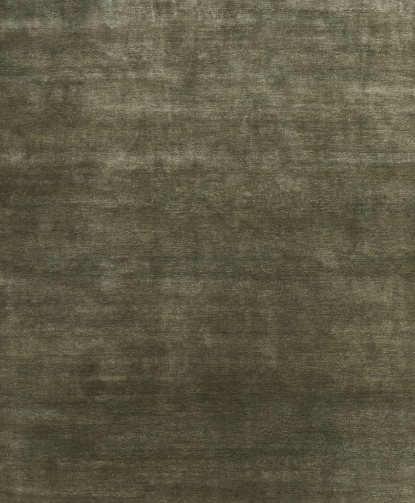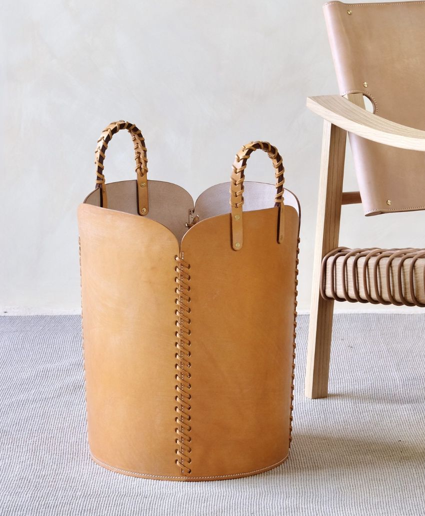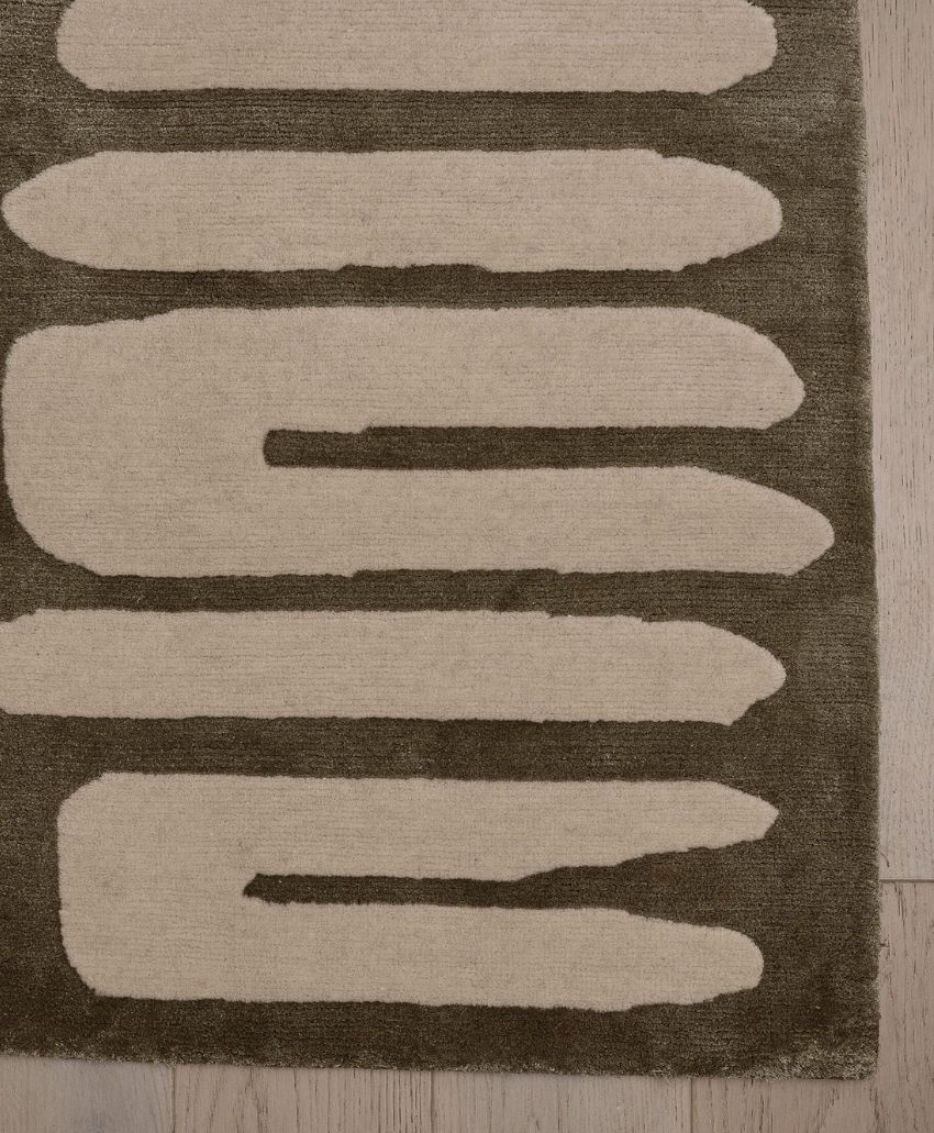 A curved, upholstered white chair sits on a textured, light brown woven rug, viewed from above on a gray concrete floor.