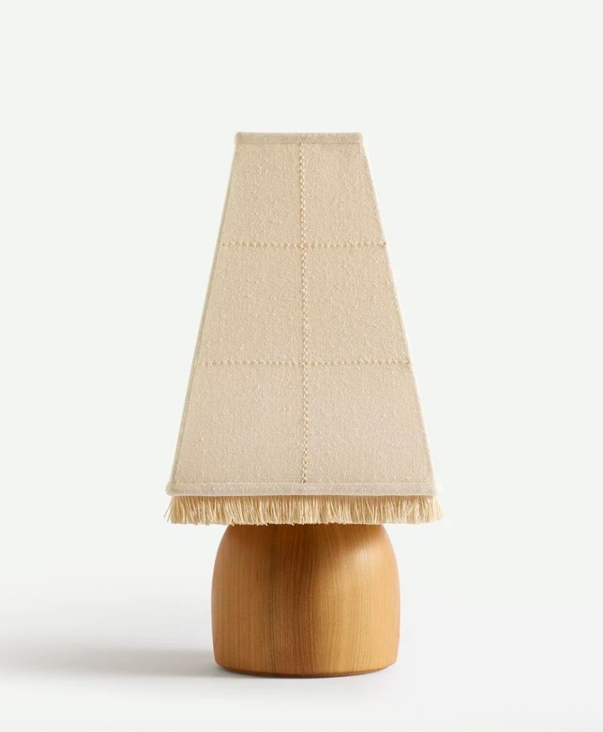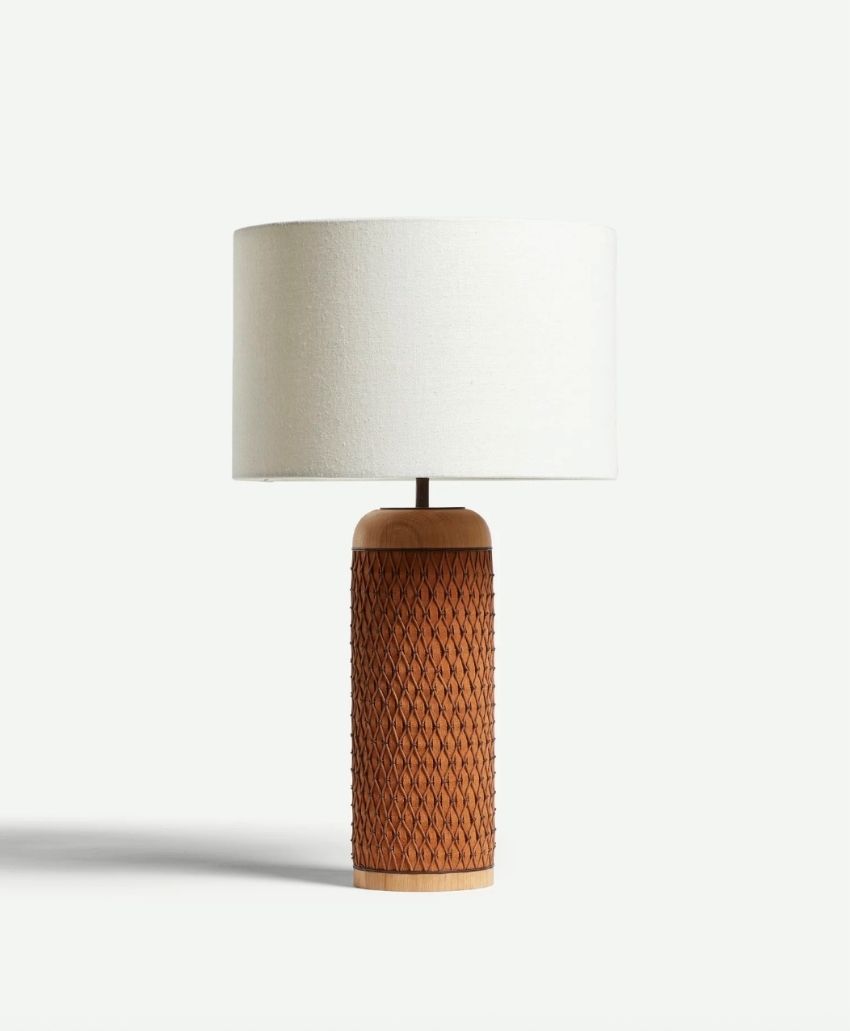 A modern table lamp with a cylindrical, textured beige shade and a silver base with a red accent, placed on a light surface against a plain, neutral background.