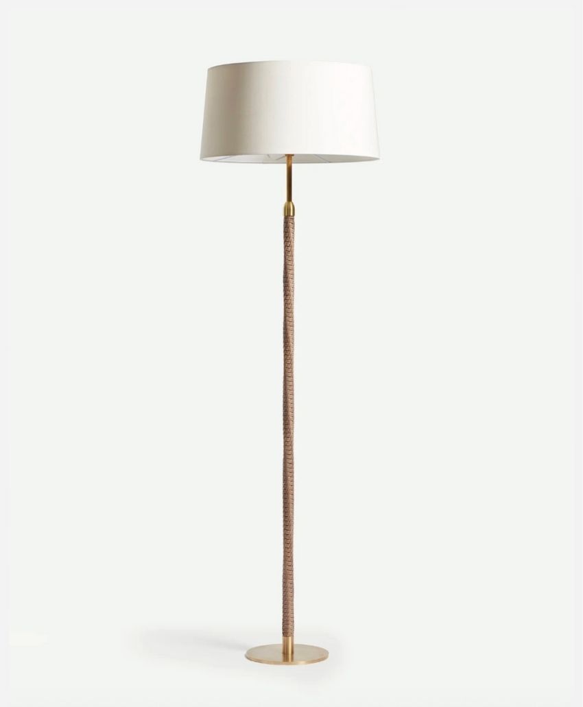 A modern pendant light with a brass fixture and a wide, pleated fabric shade, hanging from a ceiling against a neutral background.