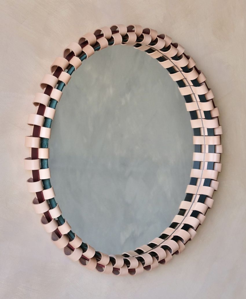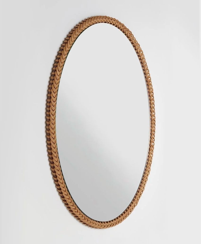 A wooden picture frame with a woven pattern stands upright on a plain white background, supported by an attached stand. The frame is empty, displaying a blank, light-colored insert.