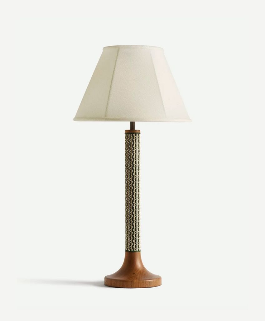 A small table lamp with a white, dome-shaped shade and a glossy dark green cylindrical base, set against a neutral beige background.