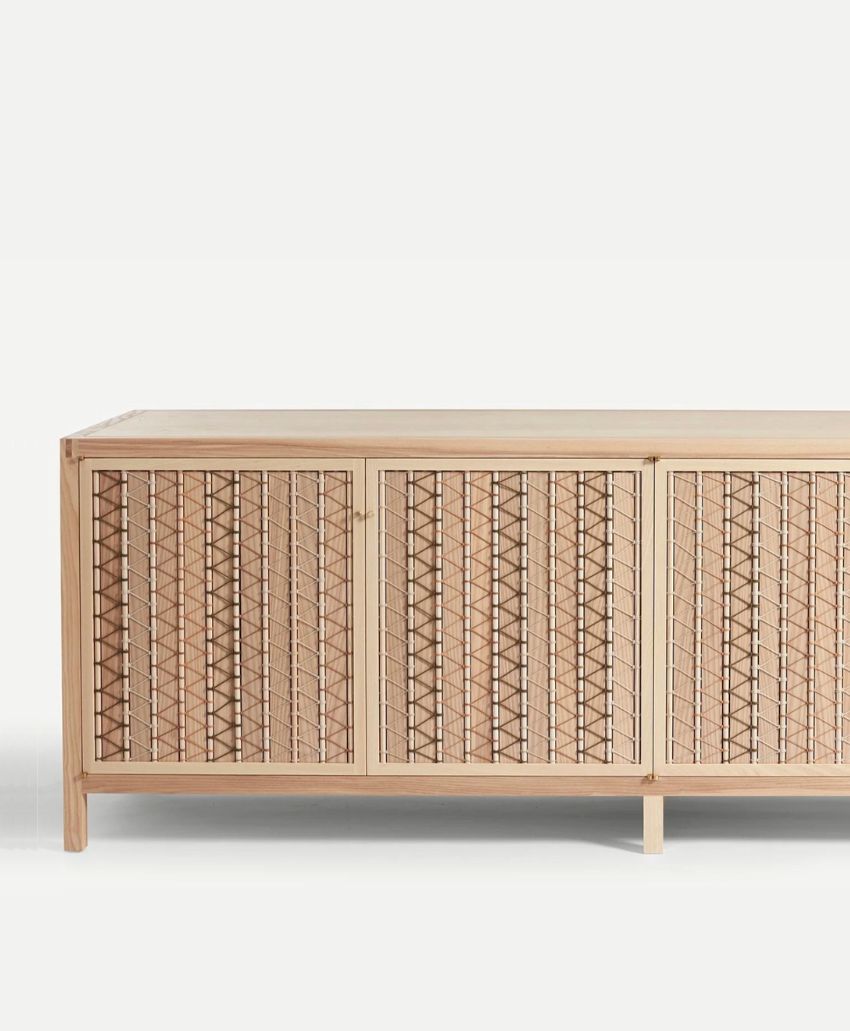 A modern, minimalist wooden console table with clean lines, three drawers, and two rectangular legs, set against a plain white background.