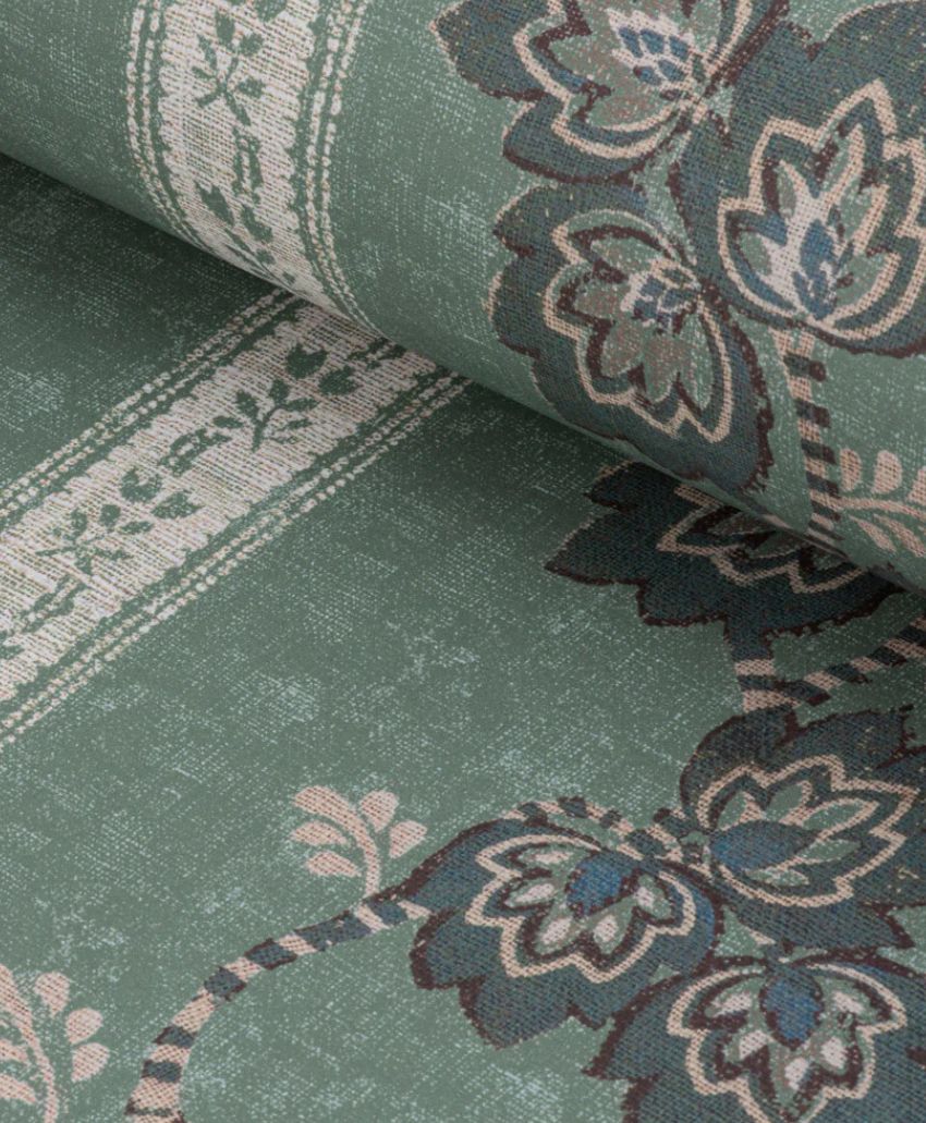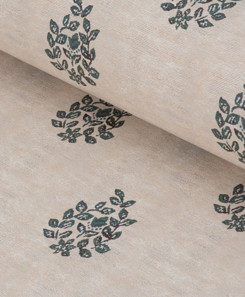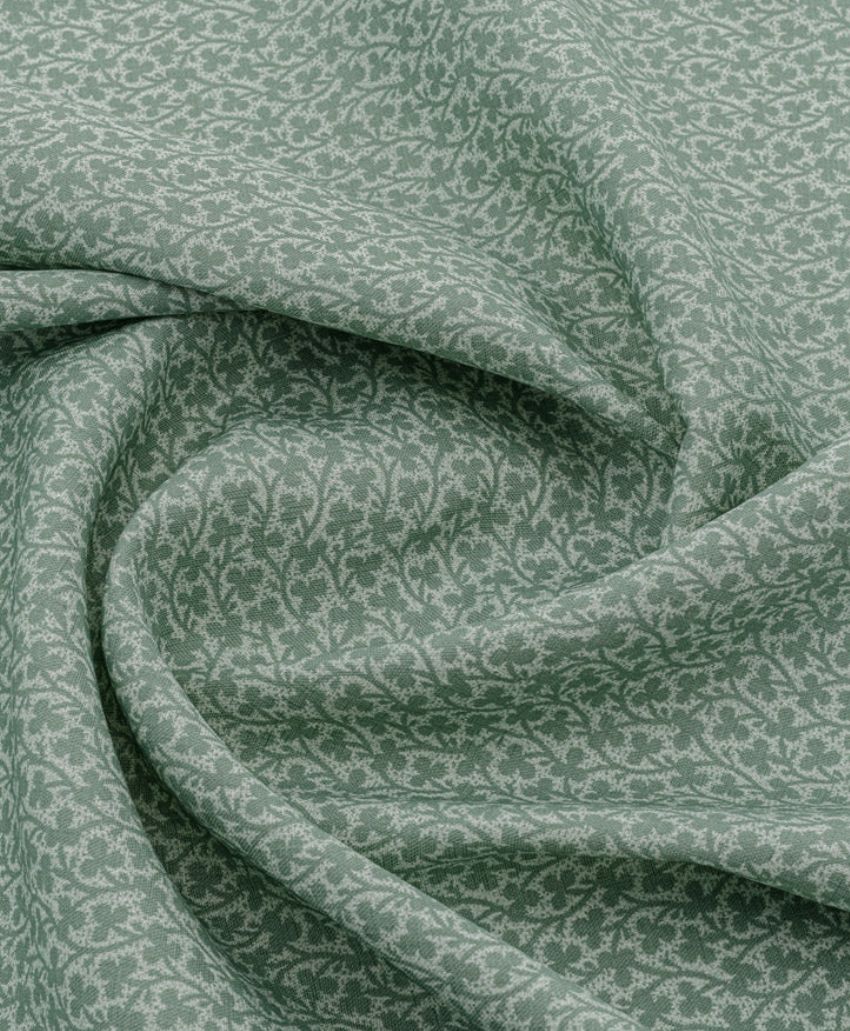 A square swatch of dark green fabric featuring a repeating pattern of small, white, stylized flowers with thin, curving stems and leaves. The edges of the fabric are zigzag cut.