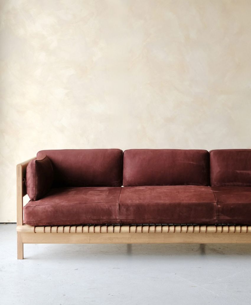 A green velvet sofa with two seat cushions is placed against a plain, light-colored wall on a wooden floor. Three small wooden toys are arranged on the floor near the bottom right corner of the sofa.