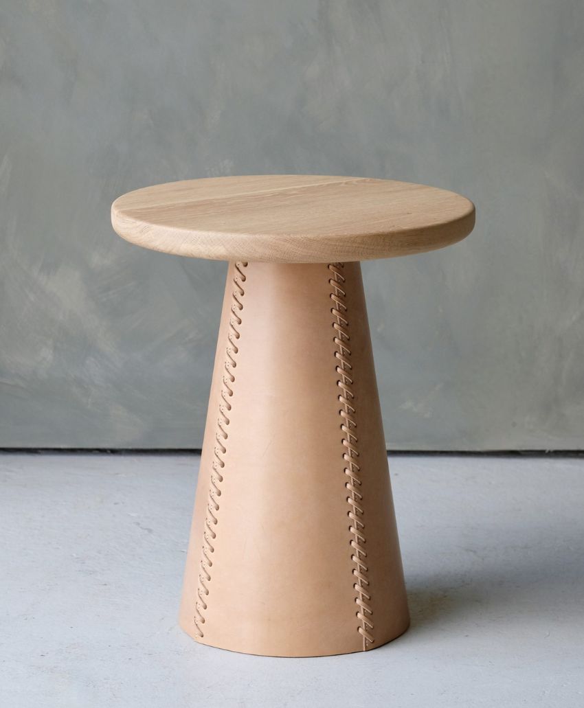 A metallic, cylindrical table lamp with a rough, textured surface and a recessed white bulb in the center, placed on a light-colored surface with a visible black power cord.